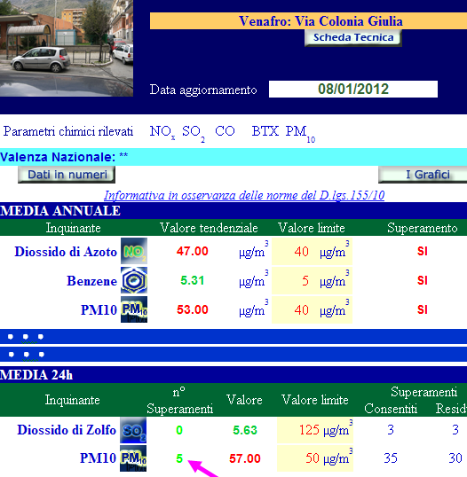 n° 5 gli sforamenti per la centralina di Venafro situata in Via Colonia Giulia e
