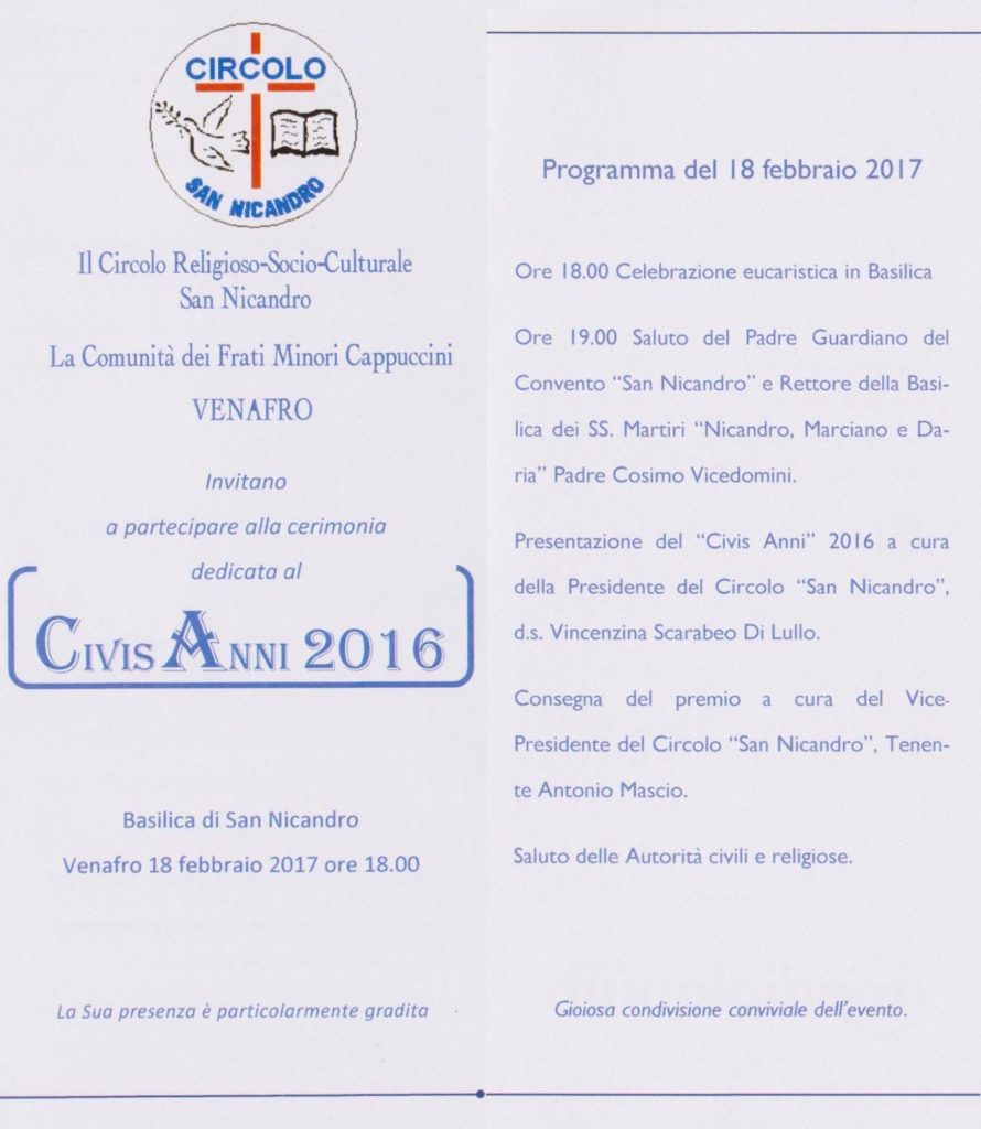 L’Associazione “Mamme per la Salute e L’Ambiente Onlus” è lieta di Invitare tutti alla consegna del premio Civis Anni 2016 alla nostra associazione che avverrà Sabato 18 Febbraio 2017 alle ore 18.00 presso il Convento di San Nicandro a Venafro.
