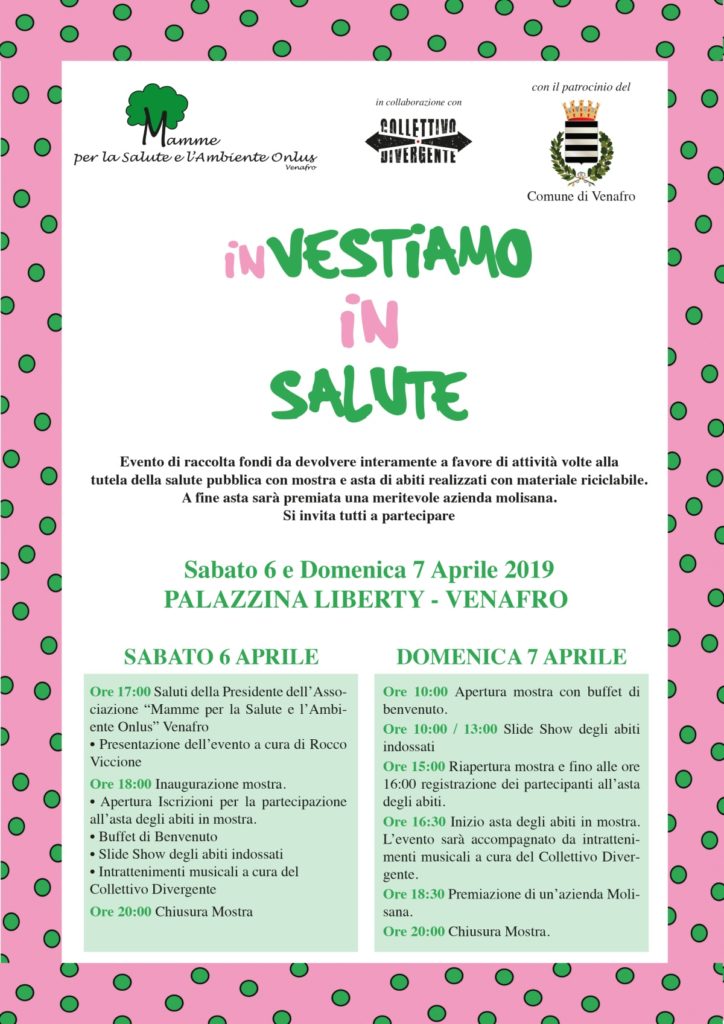 L’Associazione “Mamme per la Salute e l’Ambiente Onlus” di Venafro, in collaborazione con il Collettivo Divergente e con il patrocinio del Comune di Venafro, promuove un evento dal titolo “ Investiamo in salute” che si terrà nei locali della Palazzina Liberty di Venafro nei giorni di Sabato 6 e Domenica 7 Aprile 2019, come da locandina che si può vedere e scaricare al link:.