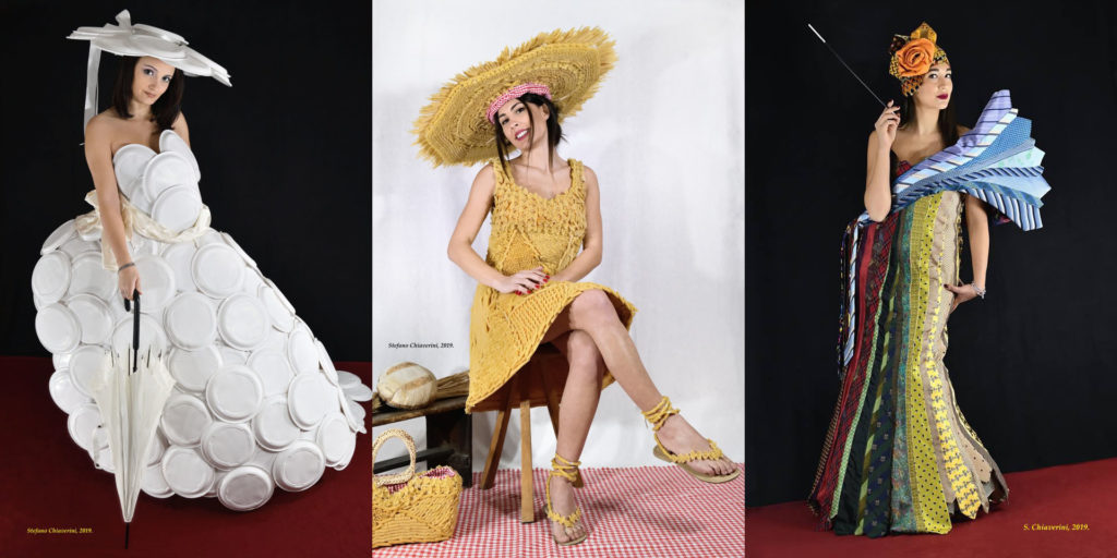 L’Evento è incentrato sulla mostra di 13 abiti realizzati dall’associazione con materiale riciclabile, di cui 12 saranno messi all’asta Domenica 7 aprile, uno invece sarà donato. Pubblichiamo le foto di 3 dei 13 abiti a titolo indicativo del genere di recupero messo in essere e di riutilizzo di materiali che, sottratti alle discariche ed agli inceneritori riprendono nuova vita.