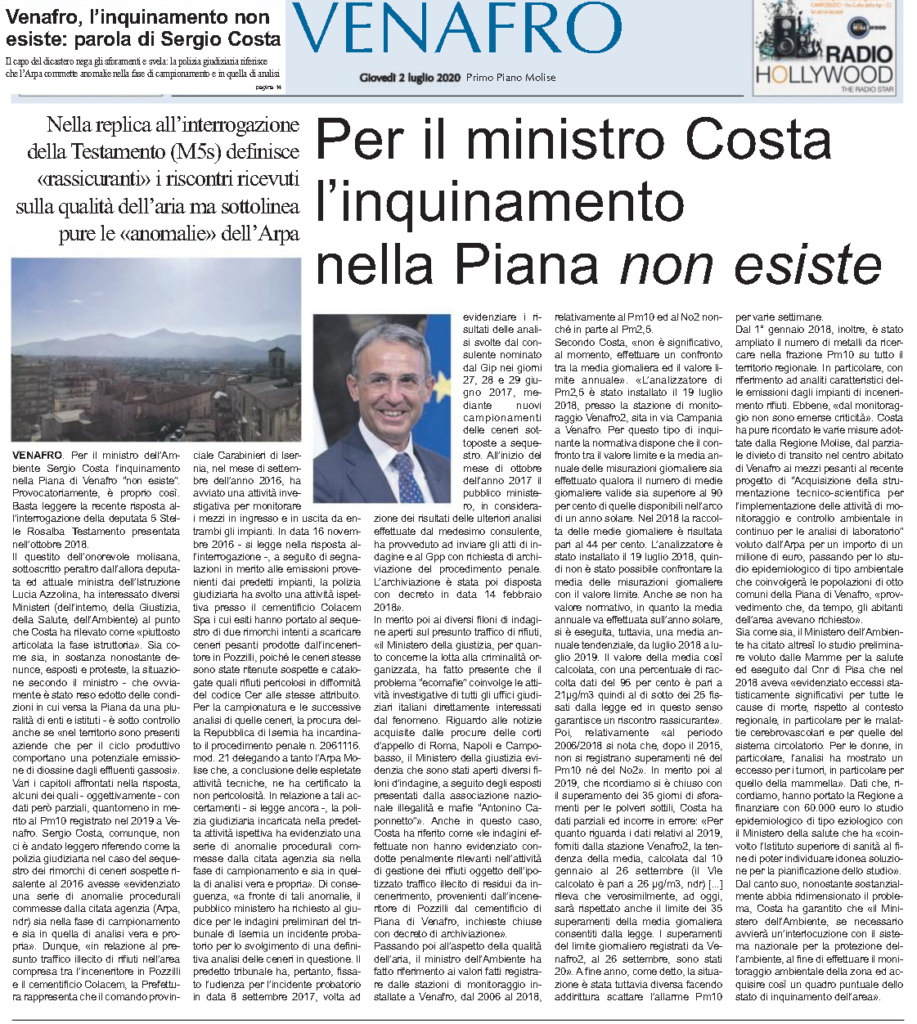 In merito all’articolo apparso oggi su “Primo piano Molise dal titolo “Per il ministro Costa l’inquinamento nella piana non esiste”, la nostra Associazione è stata sollecitata da più parti a dare un parere sulle dichiarazioni in esso contenute. Leggendo i documenti ufficiali, che postiamo in allegato, non vi è in alcun passaggio l’esplicita dichiarazione che l’inquinamento nella piana non esiste, affermazione che il giornalista evidentemente ha formulato in modo provocatorio. Si evince, invece, come i ministeri interrogati rispondono analizzando i soli dati oggettivi che gli enti territoriali hanno fatto pervenire loro, dati a nostro avviso assolutamente carenti e insufficienti a delineare la vera realtà della situazione. Emerge, ciò che da anni i cittadini denunciano alle istituzioni: mancanza di monitoraggi approfonditi, continui e costanti, eforse superficialità nel non considerare e valutare insieme TUTTI i tanti dati oggettivi già esistenti e raccolti sul territorio.Le responsabilità sono da attribuire ad una classe politica indifferente, sia Regionale che Nazionale, che continua ad anteporre altri interessi a quello supremo della salute pubblica, ma che noi continueremo ad incalzare.